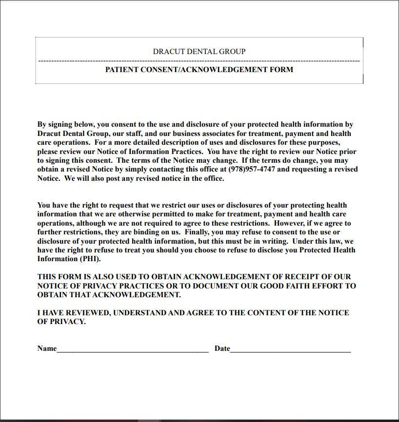 At Dracut Dental Group, we understand that your time is valuable. That's why we've made it easier for you to prepare for your appointment with our downloadable patient forms. With this feature, you can fill out your forms at your convenience, ensuring a smooth and efficient visit. Please print our patient forms and have them ready for your appointment if you're able to. Don't hesitate to get in touch with us for any assistance you may need.
